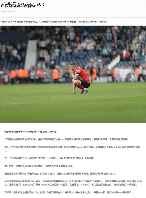 ,在过去两个赛季,卢顿遭遇连续降级,一路从顶级联赛英超降级到了现在的英甲。