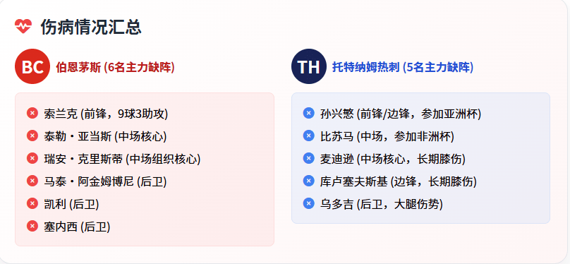 伤病是本场比赛最大的变量,两队均面临严重的人员不整。伯恩茅斯的伤病名单堪称“灾难性”,6名主力确认缺阵,包括锋线核心索兰克、中场核心库克与克里斯蒂,以及后卫凯利、扎巴尼等防线关键球员。替补中卫斯蒂芬斯转身速度慢,面对热刺的速度型边锋时将极为吃力,防线质量大打折扣。